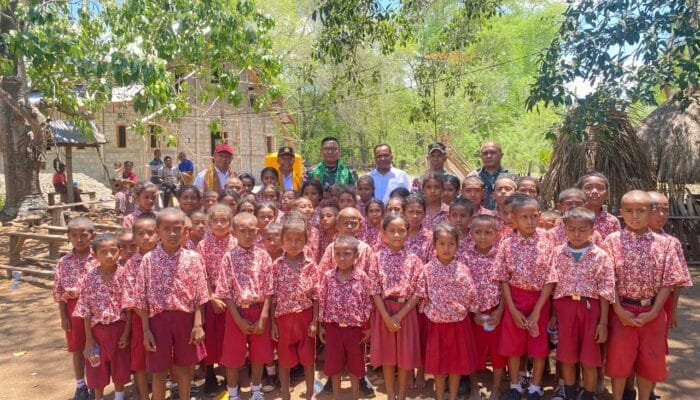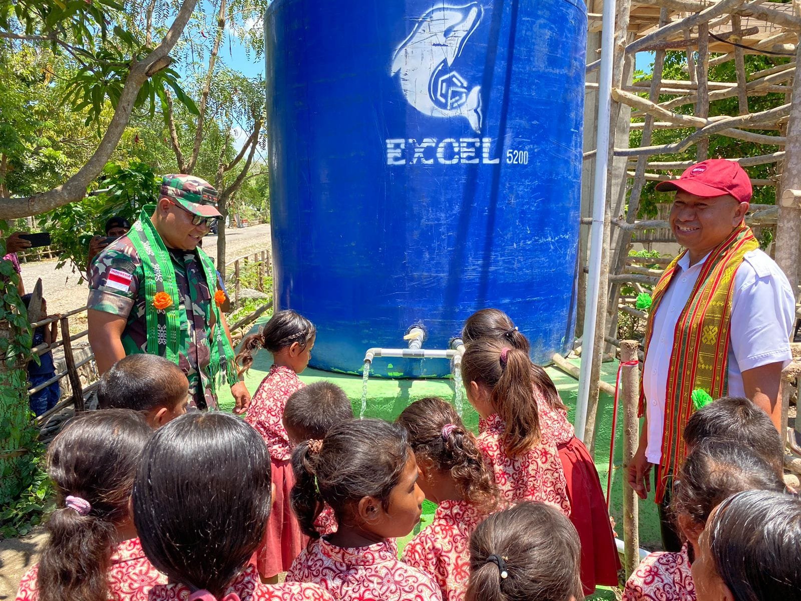 Dandim 1618/TTU Letkol Arm Didit Prasetyo Purwanto, S.E., saat pose bersama anak-anak sekolah saat meresmikan satu titik air sumur bor di Desa Kuaken, Kecamatan Noemuti Timur, Kabupaten Timor Tengah Utara (TTU), pada Rabu (20/11/2024). (Foto: Pendim TTU)